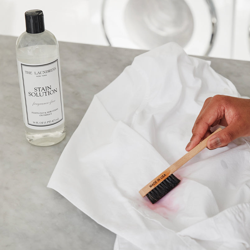 Proper bra care starts with pre treatment. Treat stains from sweat or spills with our enzymatic Stain Solution. Focus on susceptible areas such as underwires, bands, and straps and work in using a soft, dense brush like our Stain Brush.